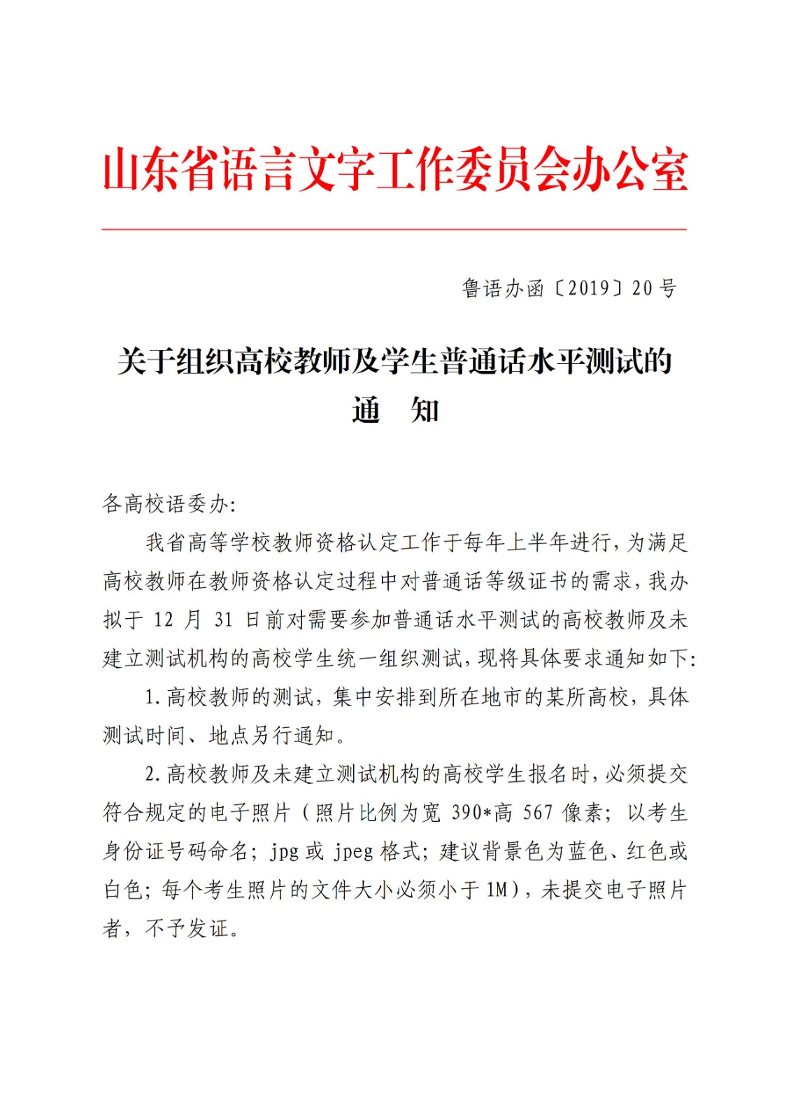 山东省语委员会办关于组织高校教师及学生普通话水平测试的 通知