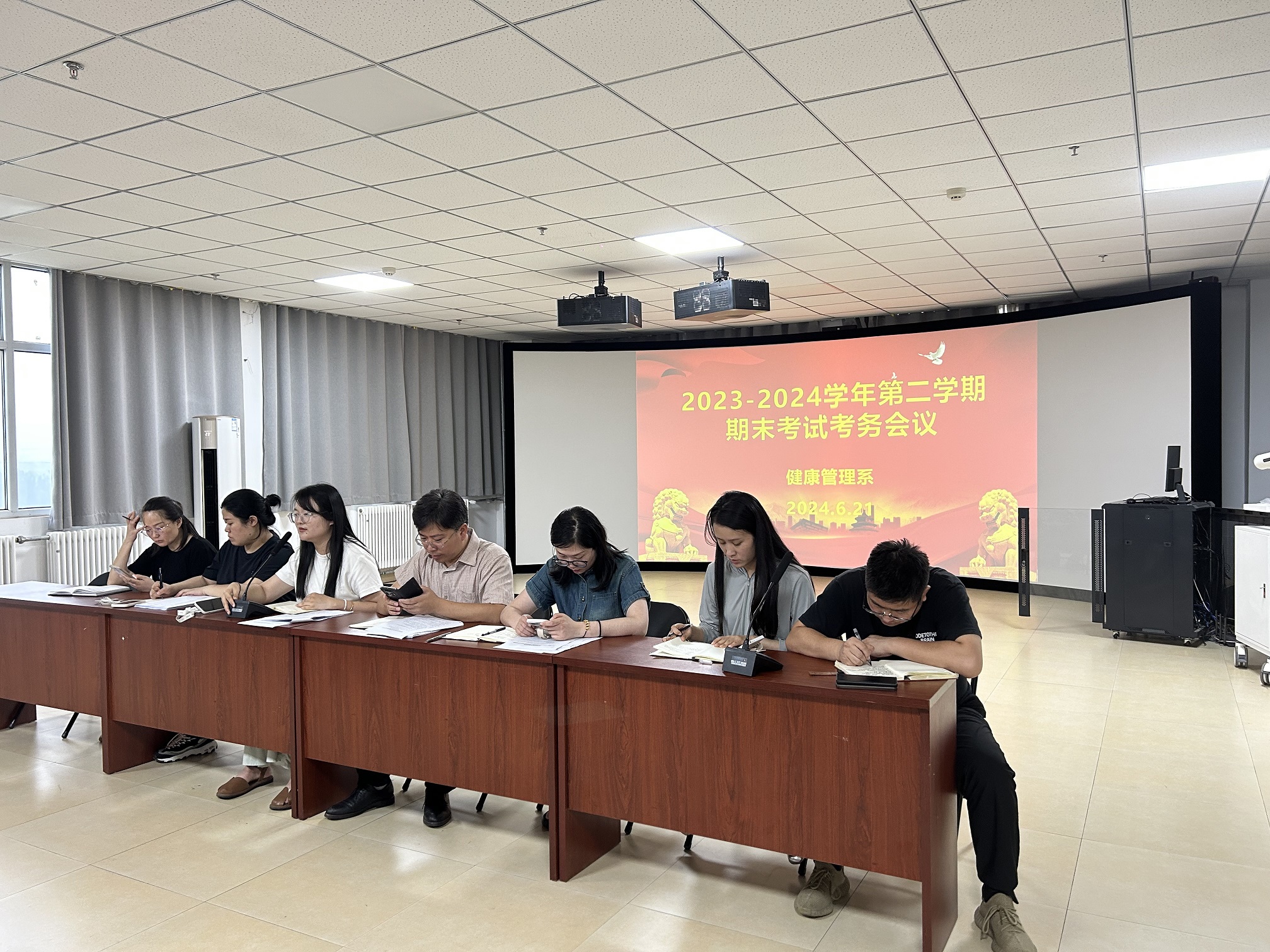 为进一步严肃考风考纪,确保本学期期末考试顺利进行,做好本学期期末考试组织工作,6月21日健康管理系在四号楼606会议室召开期末考试考务工作会议。此次会议由健康管理系主任徐西朋主持,系部全体教师参加会议。会议旨在明确考试安排、考务流程、监考要求及应急预案等事项,确保考试工作有序进行。