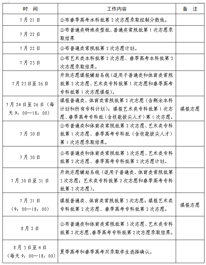 山东省2024年普通高校招生录取工作进程表