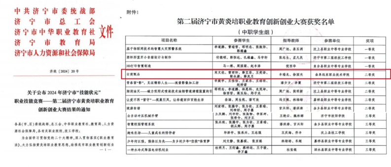 近日,由济宁市委统战部、市总工会、市中华职教社、市教育局、市人社局联合主办的2024年济宁市“技能状元”职业技能竞赛——第二届济宁市黄炎培职业教育创新创业大赛决赛圆满落下帷幕。我院工商管理系教师丰瑞龙、徐国光指导的学生代表队,在全市300余名选手,42支队伍项目中脱颖而出,荣获中职组二等奖。