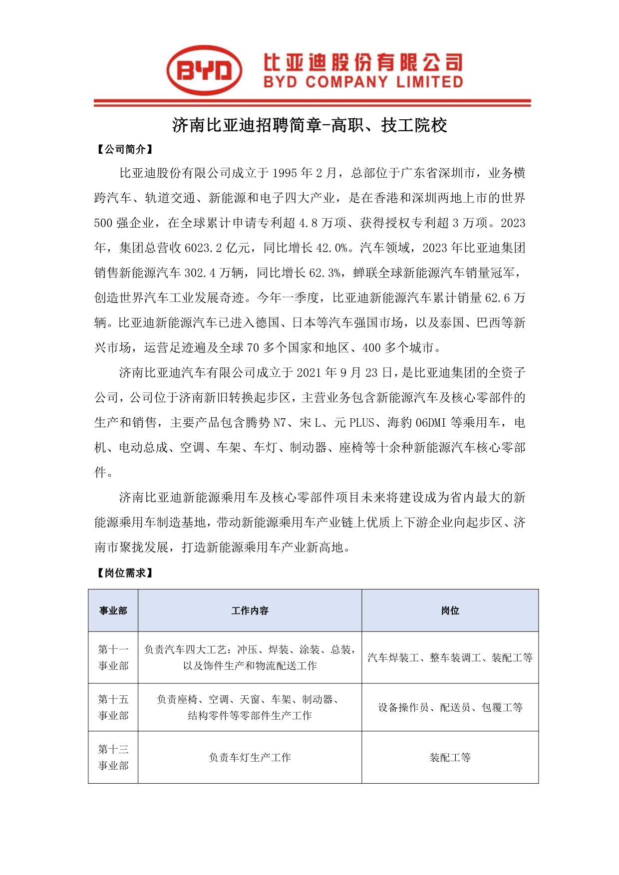 济南比亚迪招聘简章-高职、技工院校